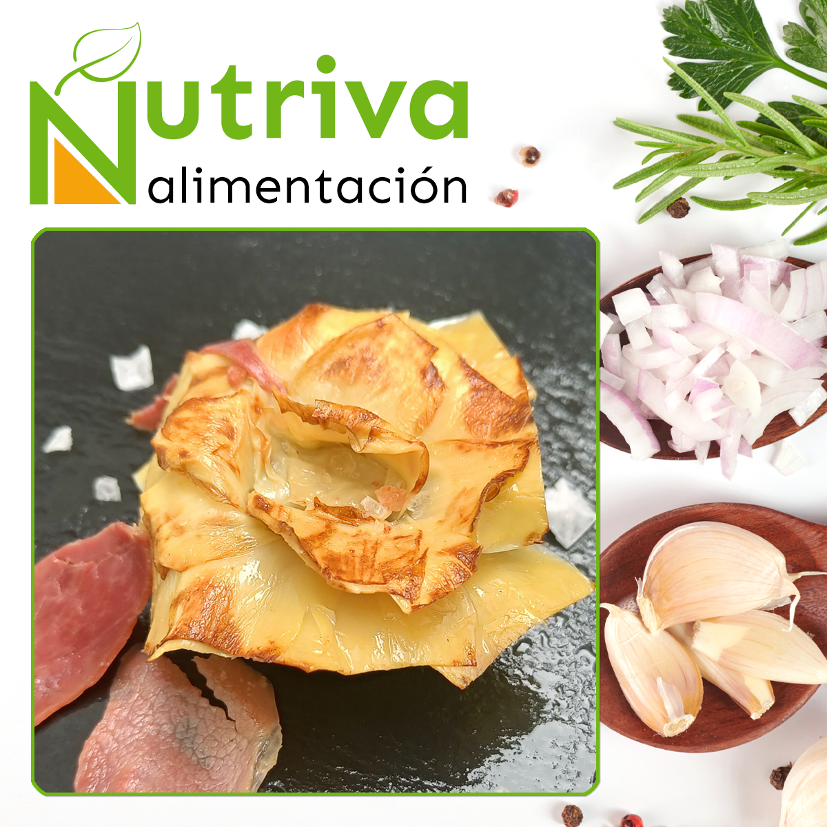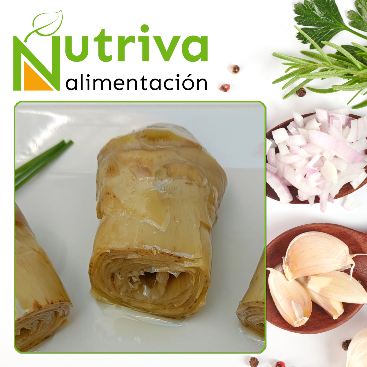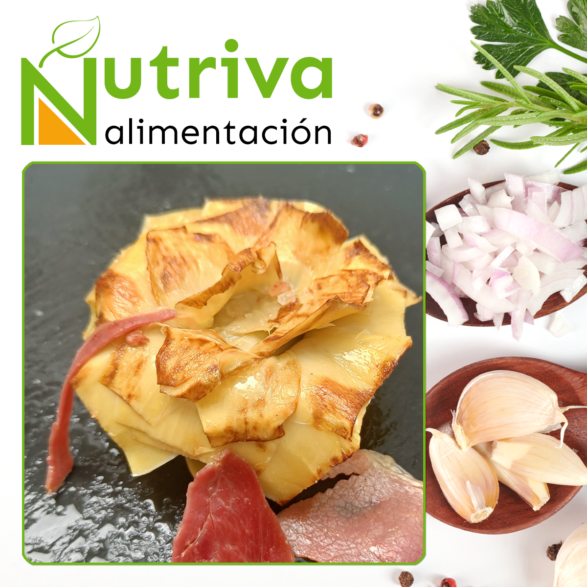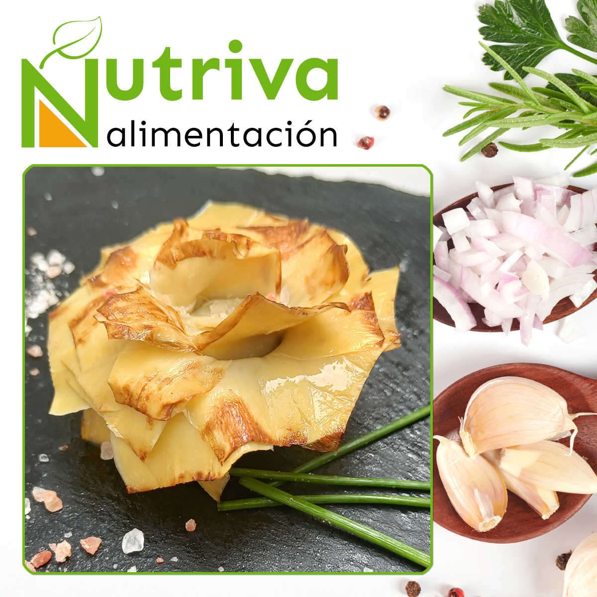 La flor de alcachofa confitada de Nutriva Alimentación (Productos Vegetales Confitados) es una preparación sofisticada y deliciosa que resalta la textura y el sabor único de la alcachofa. Para obtener este plato, las alcachofas se pelan cuidadosamente, eliminando las hojas exteriores hasta dejar solo el corazón y la base, que es donde se forma la «flor» al abrirse durante la cocción.