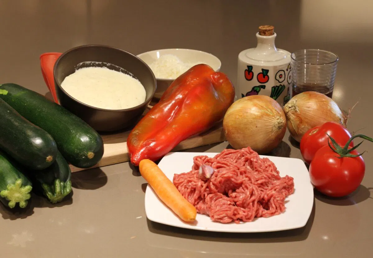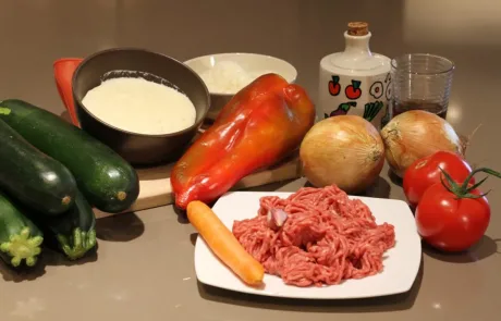 En una cazuela echamos el aceite de oliva virgen extra e introducimos las cebollas, el calabacín y el ajo. Dejamos que se pase un poco (3 minutos aproximadamente), introducimos las zanahorias y el pimiento rojo. Pochamos todas las verduras a temperatura baja unos 15 minutos y esperamos por la carne.