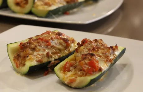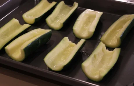 Con mucho cuidado vamos a vaciar el interior del calabacín. Con la ayuda de una cuchara retiramos el centro del calabacín (como veis en las fotos o en el vídeo) pero no en exceso, sólo un poco para que quepa el relleno. Reservamos los calabacines que hemos vaciado por un lado y la carne del calabacín (que incorporaremos al relleno) por el otro.