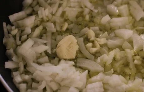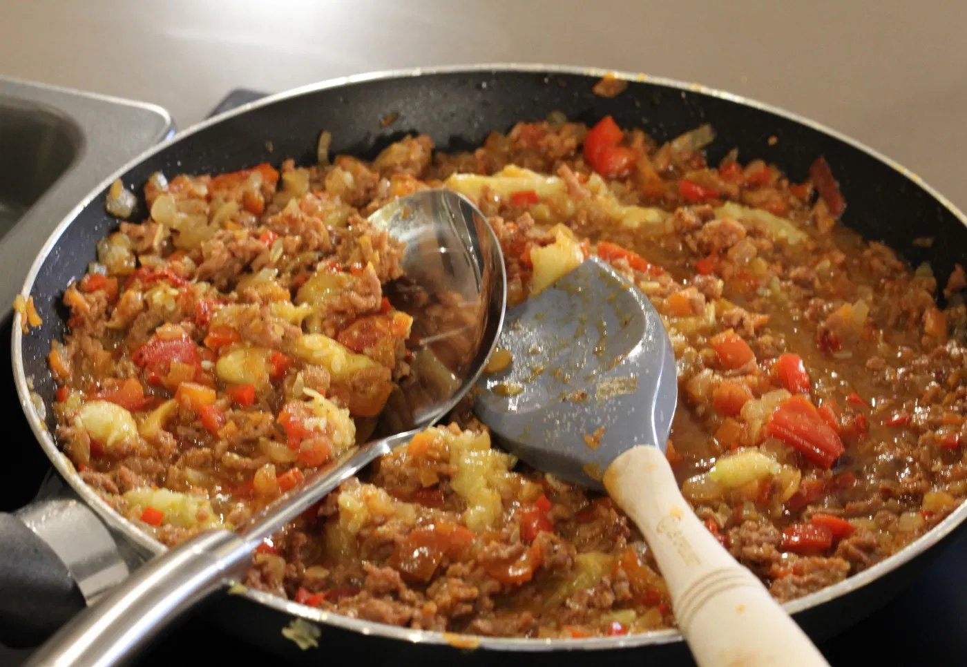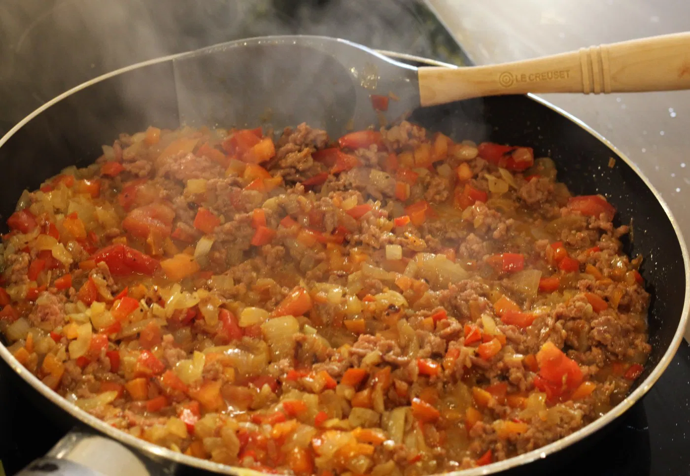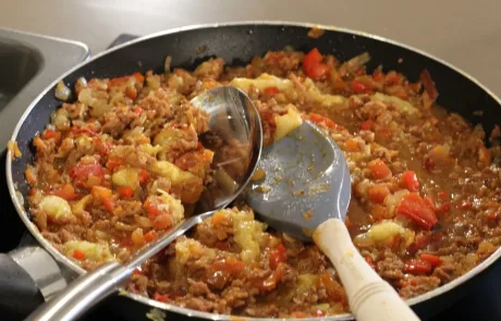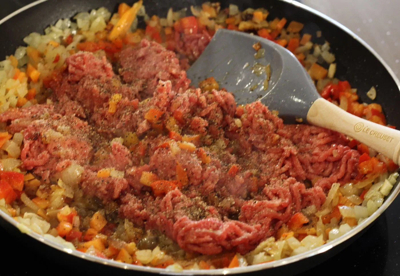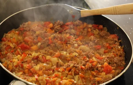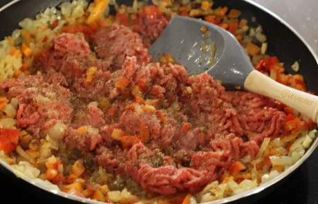 Salpimentamos (sal y pimienta) la carne (en este caso elegí una mezcla de cerdo y ternera, así el relleno queda más jugoso). Echamos la carne picada a la cazuela con las verduras y las especias a elección (un poquito de orégano, perejil…). Sofreímos durante 5-7 minutos a fuego suave, sin dejar de remover.