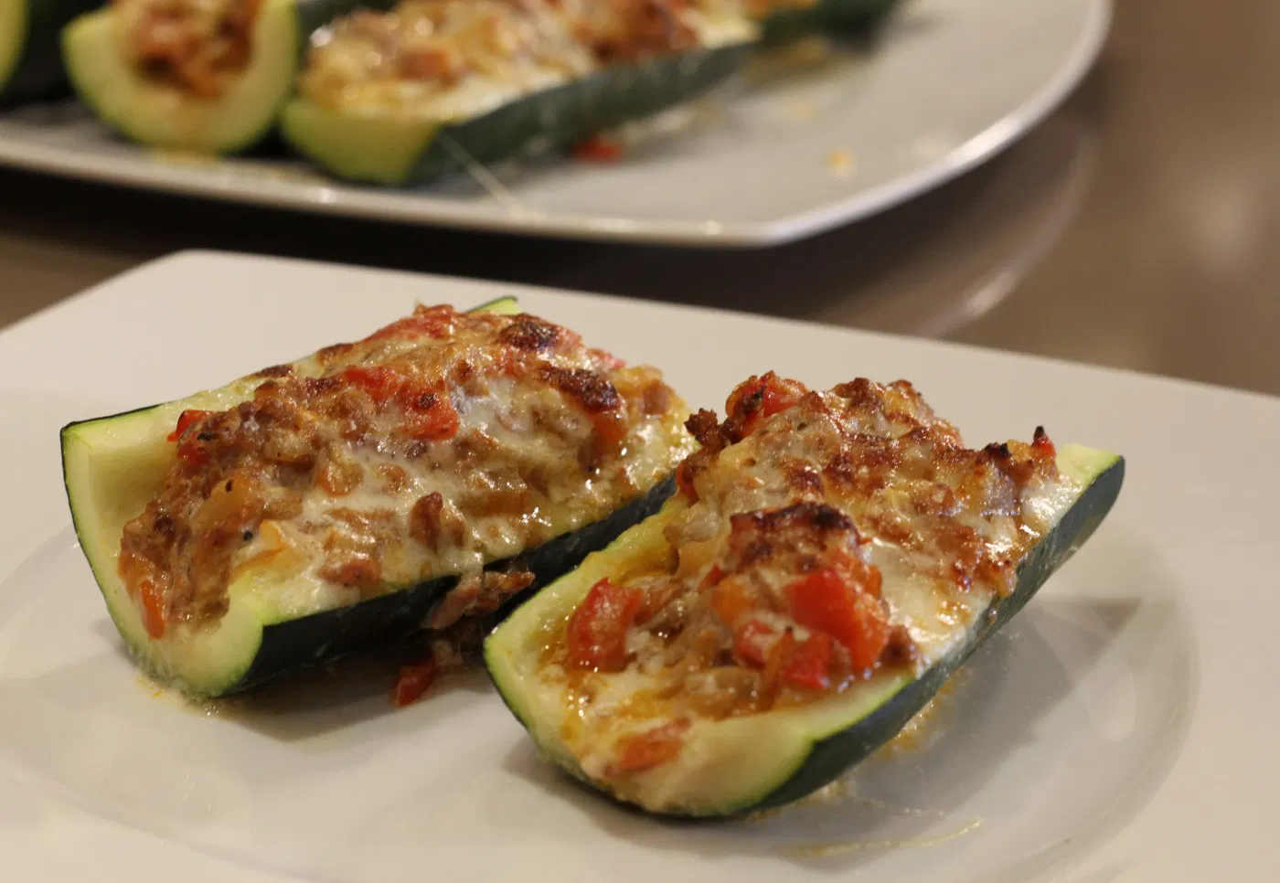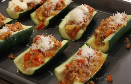 Este caldo lo dejaremos reducir en un cazo por si queremos adornar el plato, con 5 minutos a fuego fuerte tendremos una salsa espectacular. Rellenamos por encima de cada mitad con dos o tres cucharadas de bechamel. Espolvoreamos con el queso que más os guste y gratinamos 5 minutos a 220º C. Sacamos del horno y montamos el plato con dos mitades, es decir un calabacín por persona. Servidlos bien calientes.