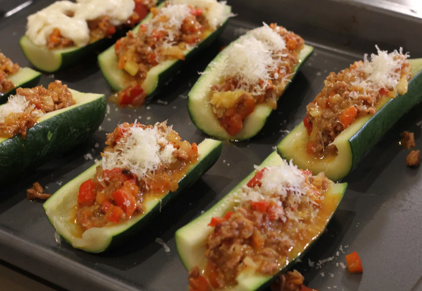 Cuando esté lista la bechamel, rellenamos los calabacines con el sofrito de carne bien escurrido, con ayuda de una espumadera para que escurra todo el caldo.