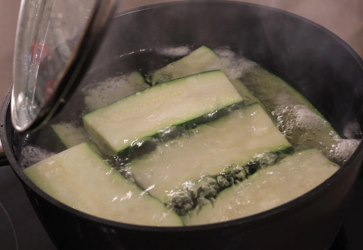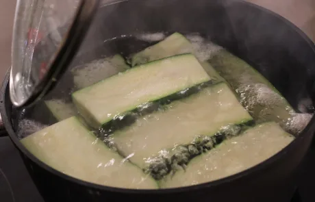 Calentamos una cazuela grande con agua, cuando empiece a hervir echamos 1 puñado generoso de sal y un chorrito de aceite de oliva virgen extra. Introducimos los calabacines entre 2 a 3 minutos (dependiendo del tamaño del calabacín) y retiramos. Secamos muy bien con papel absorbente y reservamos en un plato hasta que estén tibios.