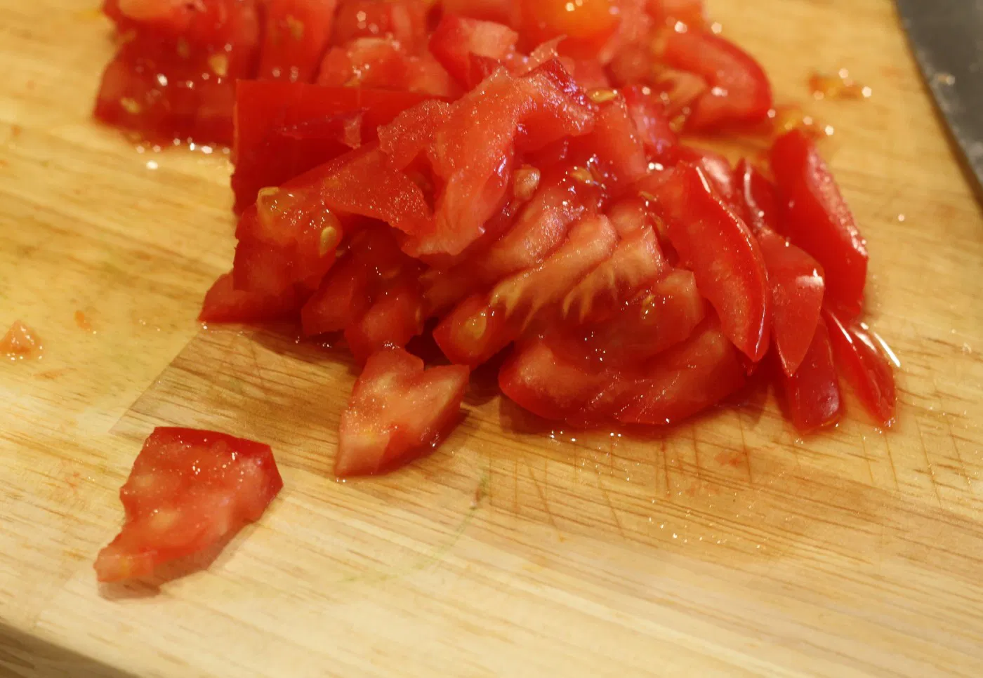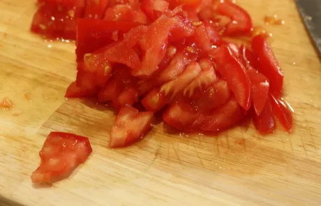 Escaldamos los tomates y una vez sin piel los picamos en trozos estilo brounoisse, en cuadraditos pequeños. Picamos las 2 cebollas, el calabacín que tenemos reservado (el de vaciar los calabacines), el pimiento rojo y el diente de ajo, todo bien finito. Pelamos y picamos la zanahoria lo mejor posible, cuanto más finas sean mejor porque se pasarán al hacer la salsa.